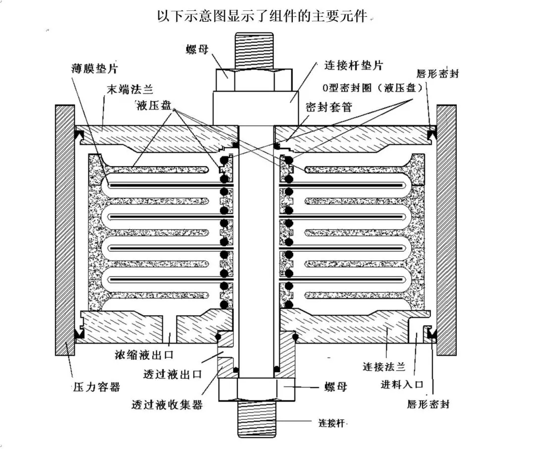 上圖放大部分顯示瞭(le)進料水流經薄膜墊片,純水透過液流經薄膜墊片並(bìng)被薄膜墊片中的絨頭織物片帶入透過液通道。液壓盤上的O型密封圈防止進料水進入透過液通道。